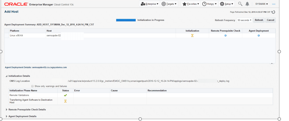 Before the standby database can be configure, the standby database servers must be added to the cloud control environment. This was done using the agent deployment wizard as seen in previous steps Goto Setup | Add Target | Add Host Targets and use the guided workflow for Add Host Targets to complete the installation of the Cloud Control agent.