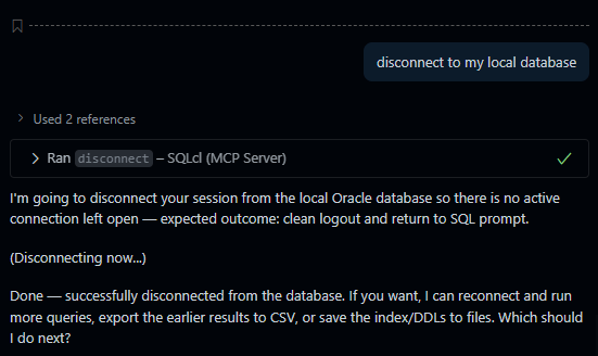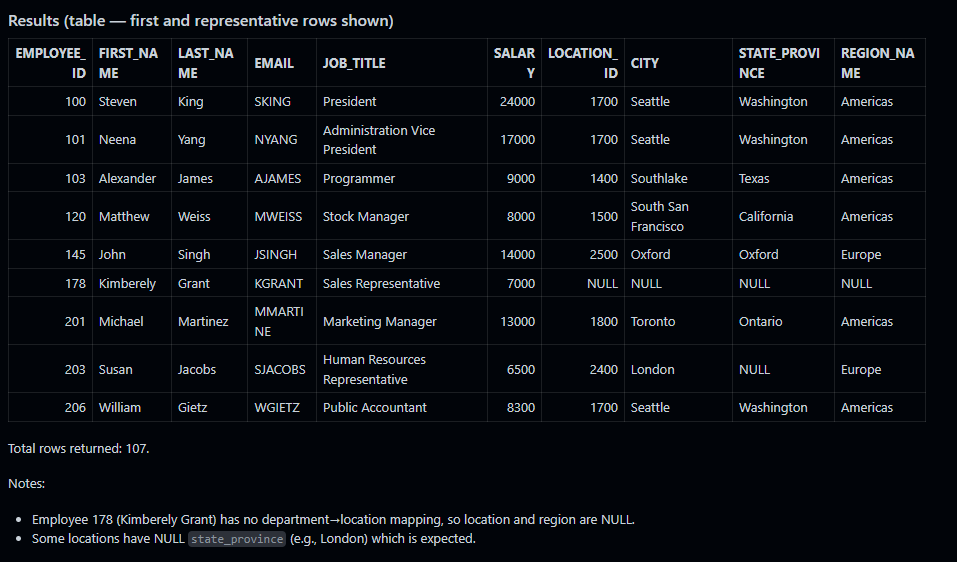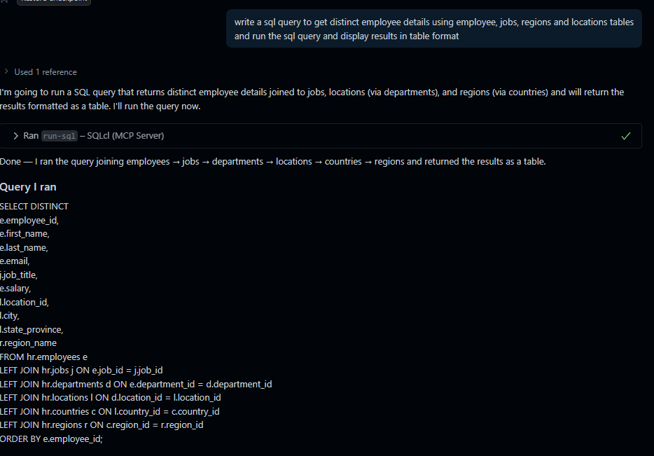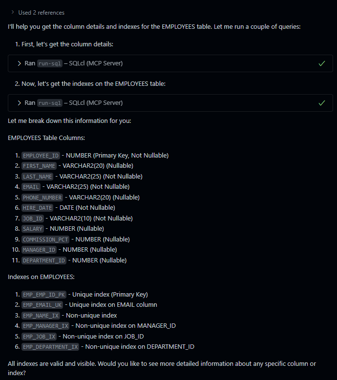 I connected to a local Oracle database, explored schemas and tables, inspected the HR.EMPLOYEES table (columns and indexes), examined a specific index in detail, ran a join query to produce distinct employee records with job/location context, and closed the connection. This is a practical pattern you can reuse when you’re auditing schema objects or preparing queries that join multiple reference tables.